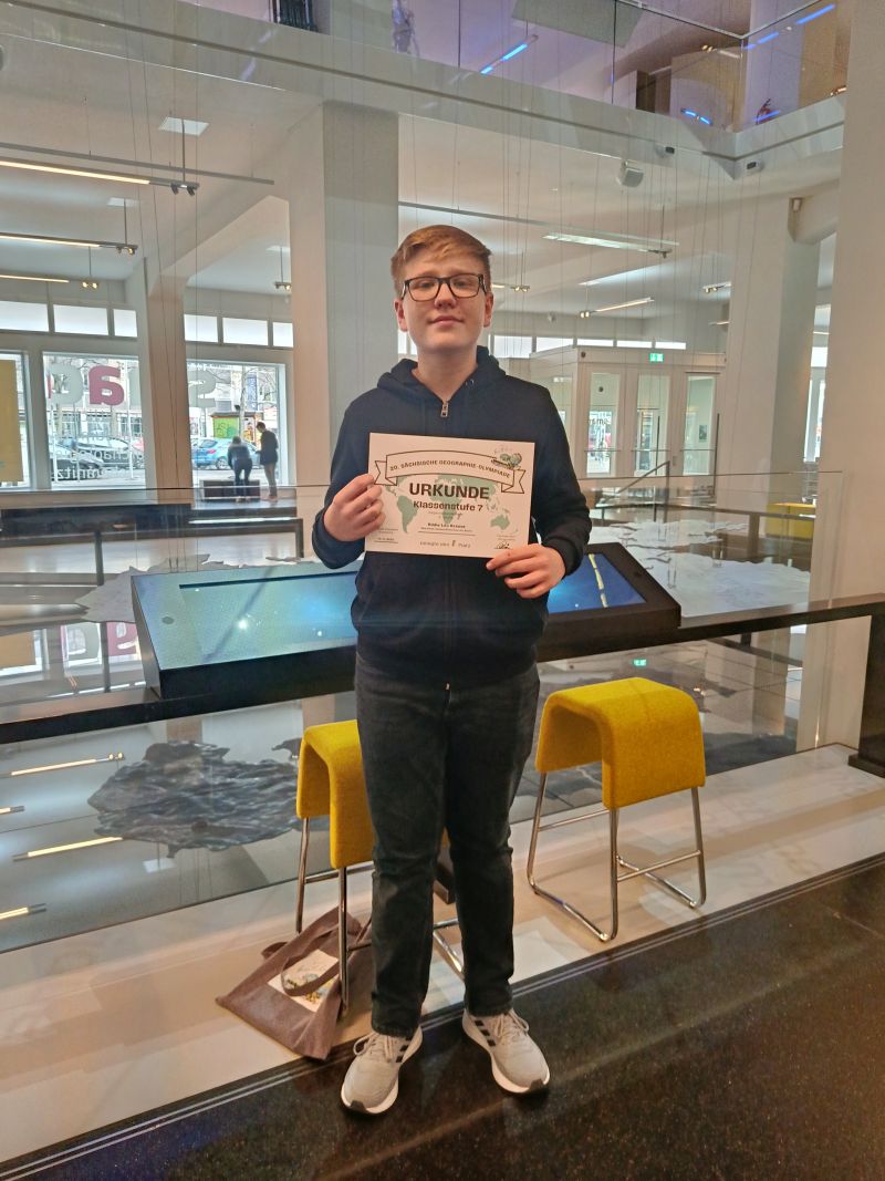 Auch in diesem Schuljahr haben die Schüler der Klassenstufen 7 und 10 an der Sächsischen Geographieolympiade teilgenommen. Die Erstplazierten haben sich für die Stufe 2 qualifiziert. Diese fand an unserer Schule statt, die Lösungen wurden zentral bewertet. Eddie Krause hat sich für den Ausscheid des Bereiches Chemnitz qualifiziert und am 13.11.2025 an der 3.Stufe des Wettbewerbes in Chemnitz teilgenommen. Mit fundierten Kenntnissen in verschiedensten geographischen Bereichen konnten er den 8.Platz belegen.